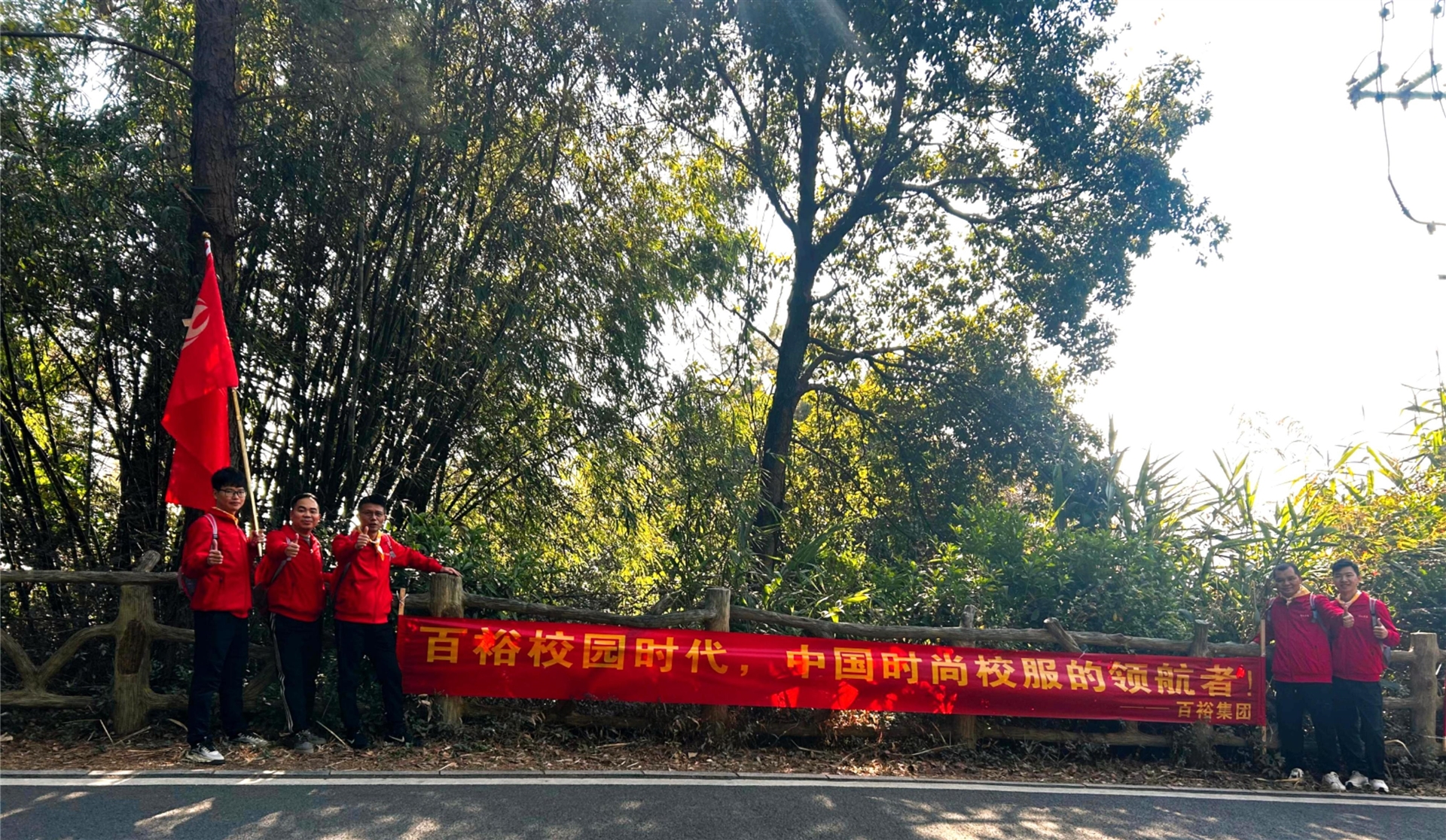 登山途中設(shè)有拍照打卡點,企業(yè)團隊們紛紛在此駐足,擺出創(chuàng)意十足的姿勢,與美麗的山景和自家公司的橫幅合影。