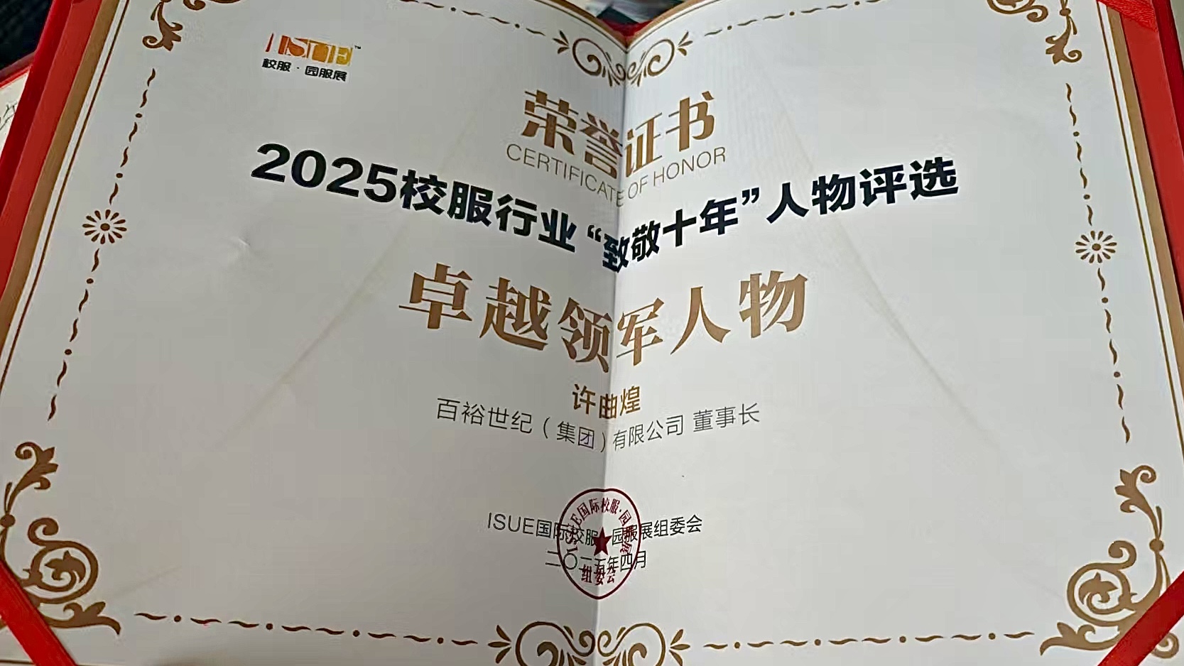 百裕集團董事長許曲煌先生憑借其在校服行業(yè)的卓越領導力、創(chuàng)新實踐與深遠貢獻,榮膺“致敬十年·卓越領軍人物”稱號。這一榮譽不僅是對其個人成就的高度認可,更是對百裕集團深耕校服領域、推動行業(yè)高質量發(fā)展的集體褒獎。