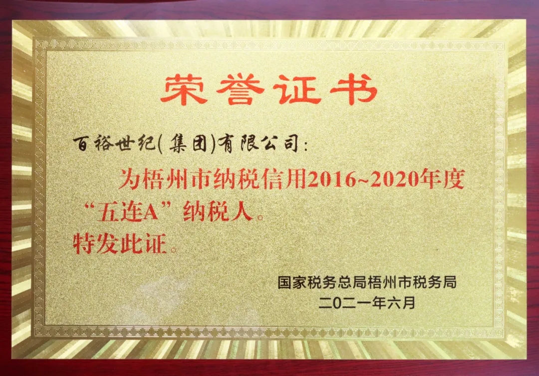 2021年6月,百裕世紀(jì)被國家稅務(wù)總局梧州市稅務(wù)局評(píng)定為梧州市納稅信用2016-2020年度“五連A”納稅人榮譽(yù)稱號(hào),并頒發(fā)證書。