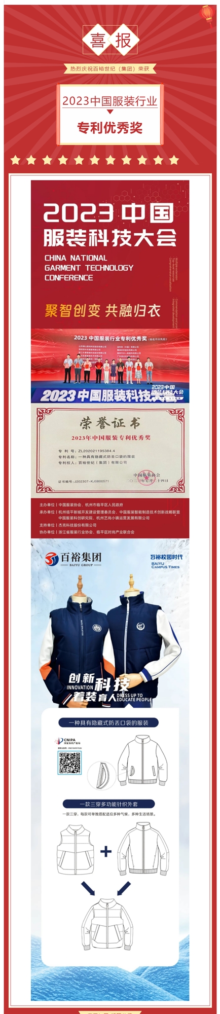 喜報 I 百裕世紀(jì)(集團)榮獲 2023中國服裝行業(yè)專利優(yōu)秀獎