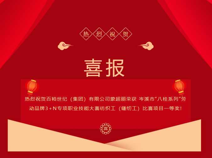 百裕世紀(jì) (集團)有限公司線下車間職工超麗榮獲紡織工 (縫工)比賽項目的一等獎;羅婷婷、陳杏娟2位職工榮獲二等獎;梁鳳、羅獻(xiàn)鳳、覃廣英、莫清云、廖芬藝5位職工榮獲三等獎;陳海蘭、陳志平、張紅潔等12名職工榮獲優(yōu)勝獎。