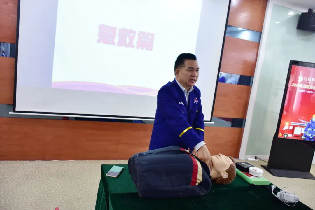 廣西仁安消防培訓(xùn)中心徐教官通過”理論+實(shí)操“相結(jié)合的方式,主要從火災(zāi)安全防范,急救知識(心肺復(fù)蘇術(shù))及使用滅火器三個(gè)方面進(jìn)行講解,并組織全員進(jìn)行消防安全實(shí)戰(zhàn)演練。