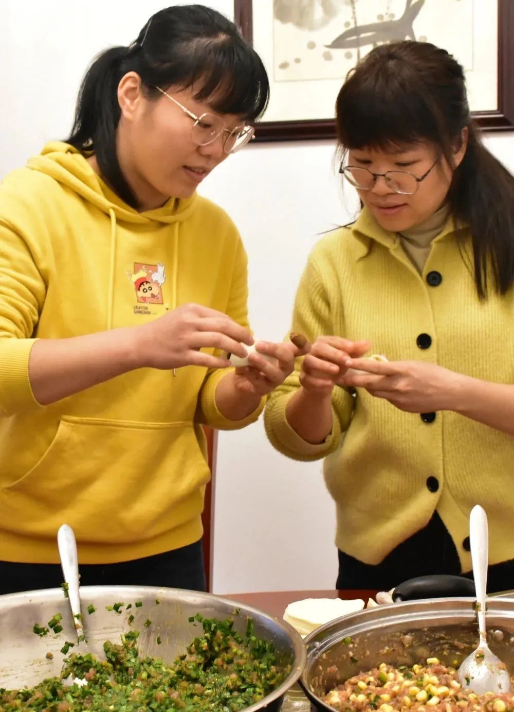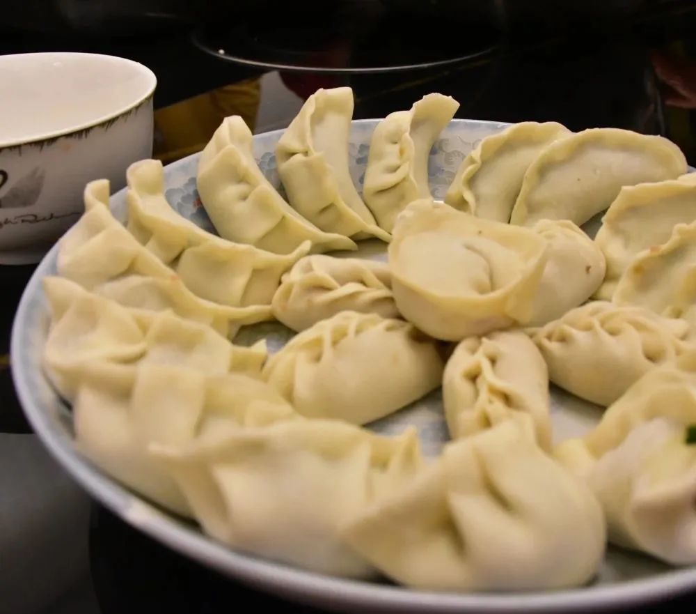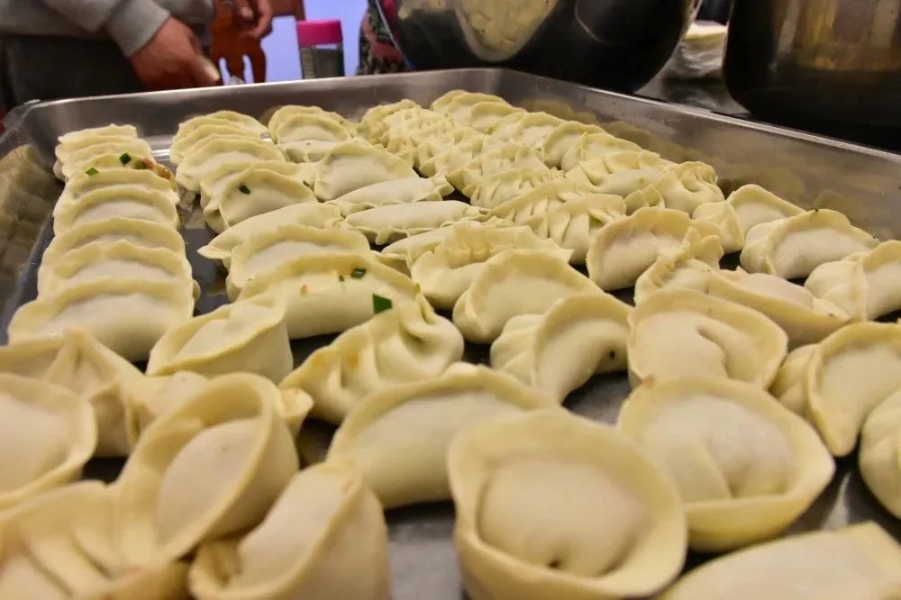 新春伊始,大家齊聚餐廳各顯神通,放餡、捏皮,完整連貫。一會兒功夫,一盤盤大小勻稱、緊實飽滿、形狀美觀的餃子整齊地擺上了臺面:月牙狀、元寶狀、柳葉狀等各式各樣的餃子組成了一桌餃子“全家?!?,堪比精美花朵百花齊放。