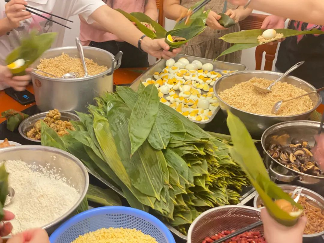 6月21日,百裕集團(tuán)南寧營(yíng)銷中心的同事們?cè)缭缇蛠?lái)到餐廳進(jìn)行準(zhǔn)備工作,各顯神通?;顒?dòng)中大家一起交流包粽子的技巧
