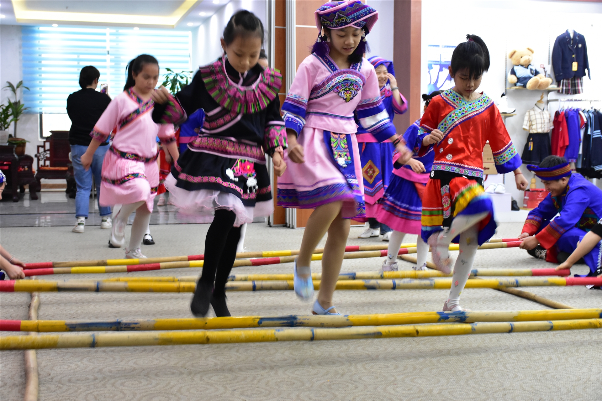 跳進去,跳出來;小竹竿,動起來......伴隨著竹竿清脆的敲擊聲,孩子們依次跳過竹竿陣,體驗節(jié)日的歡樂及感受壯鄉(xiāng)的民族風(fēng)情。