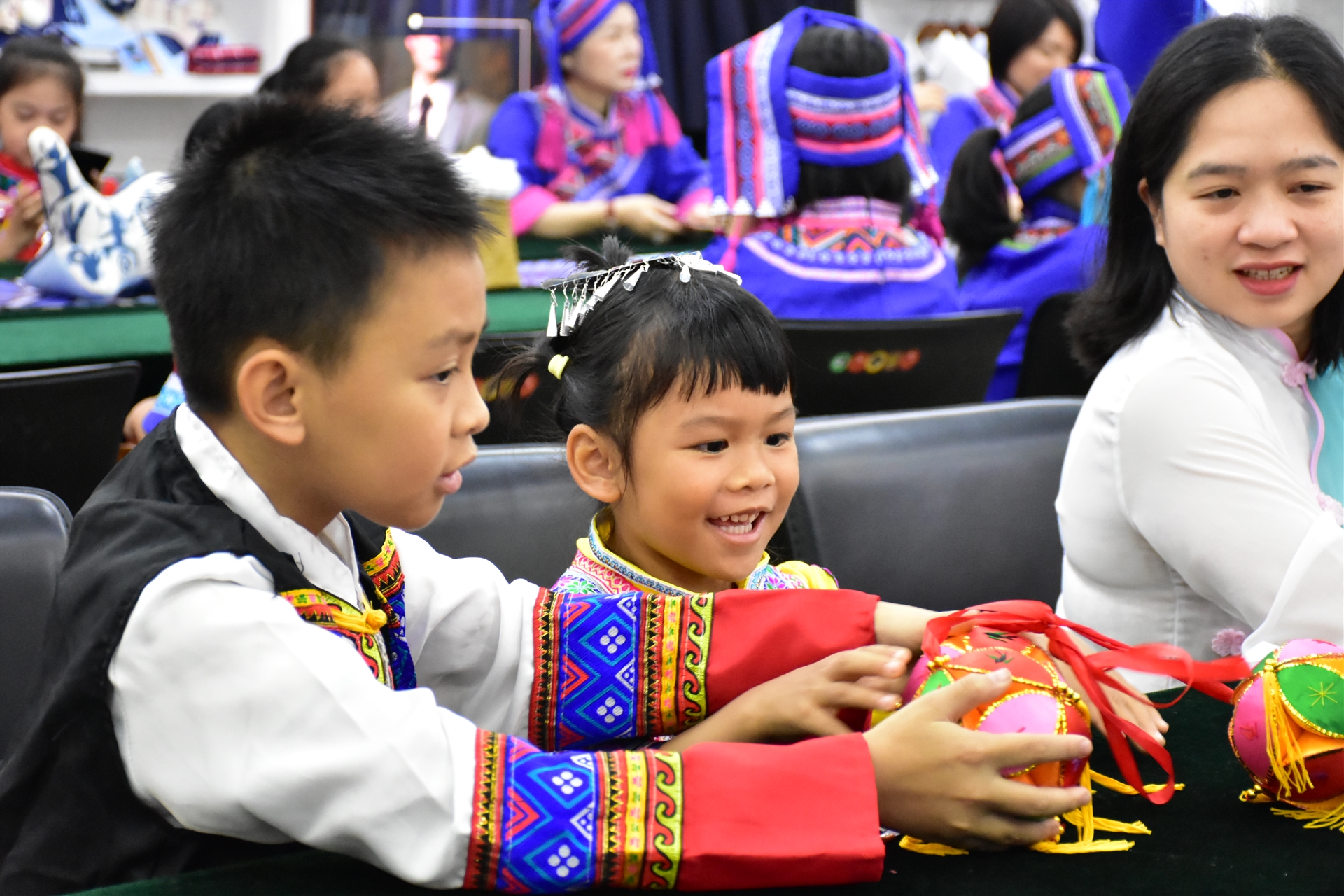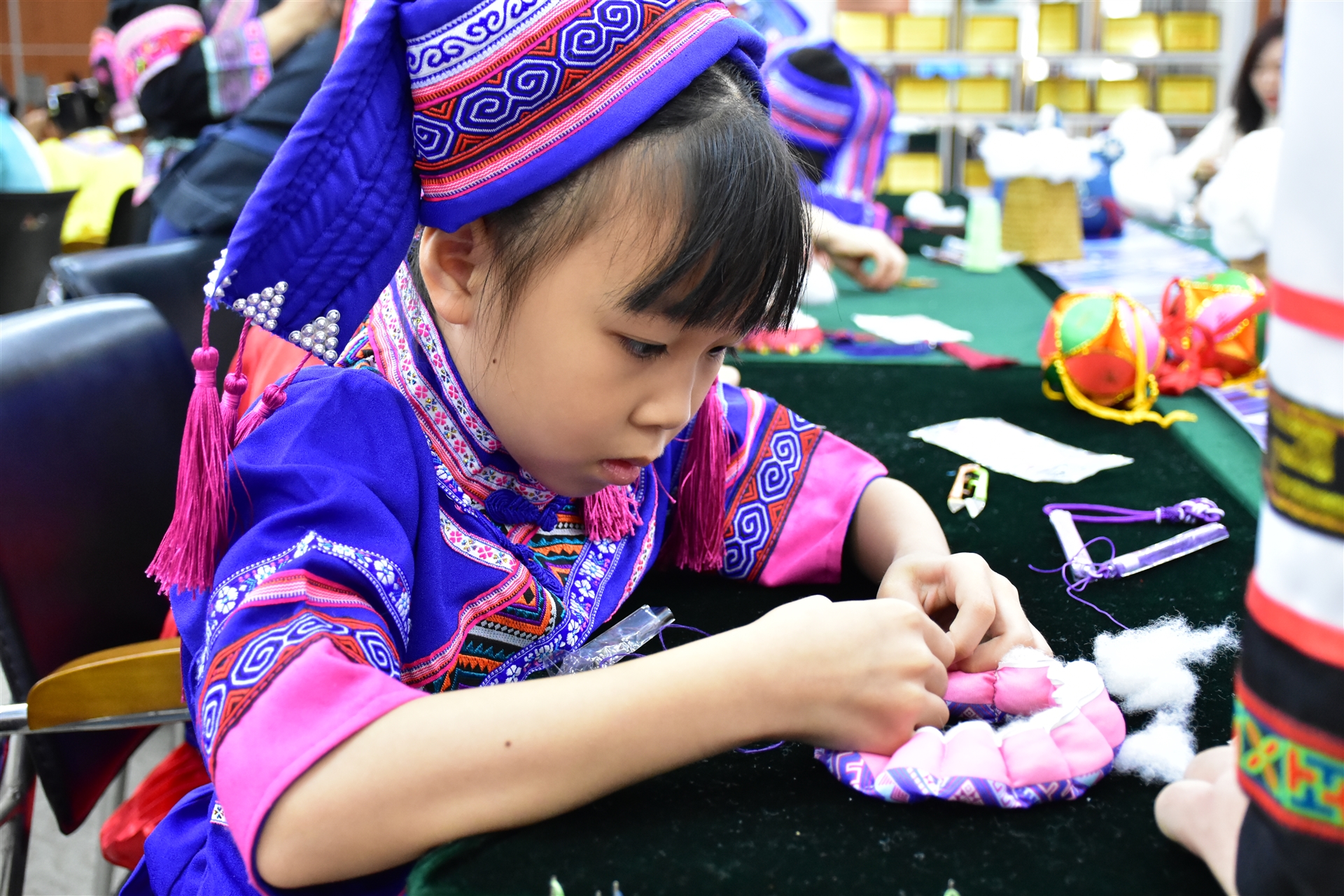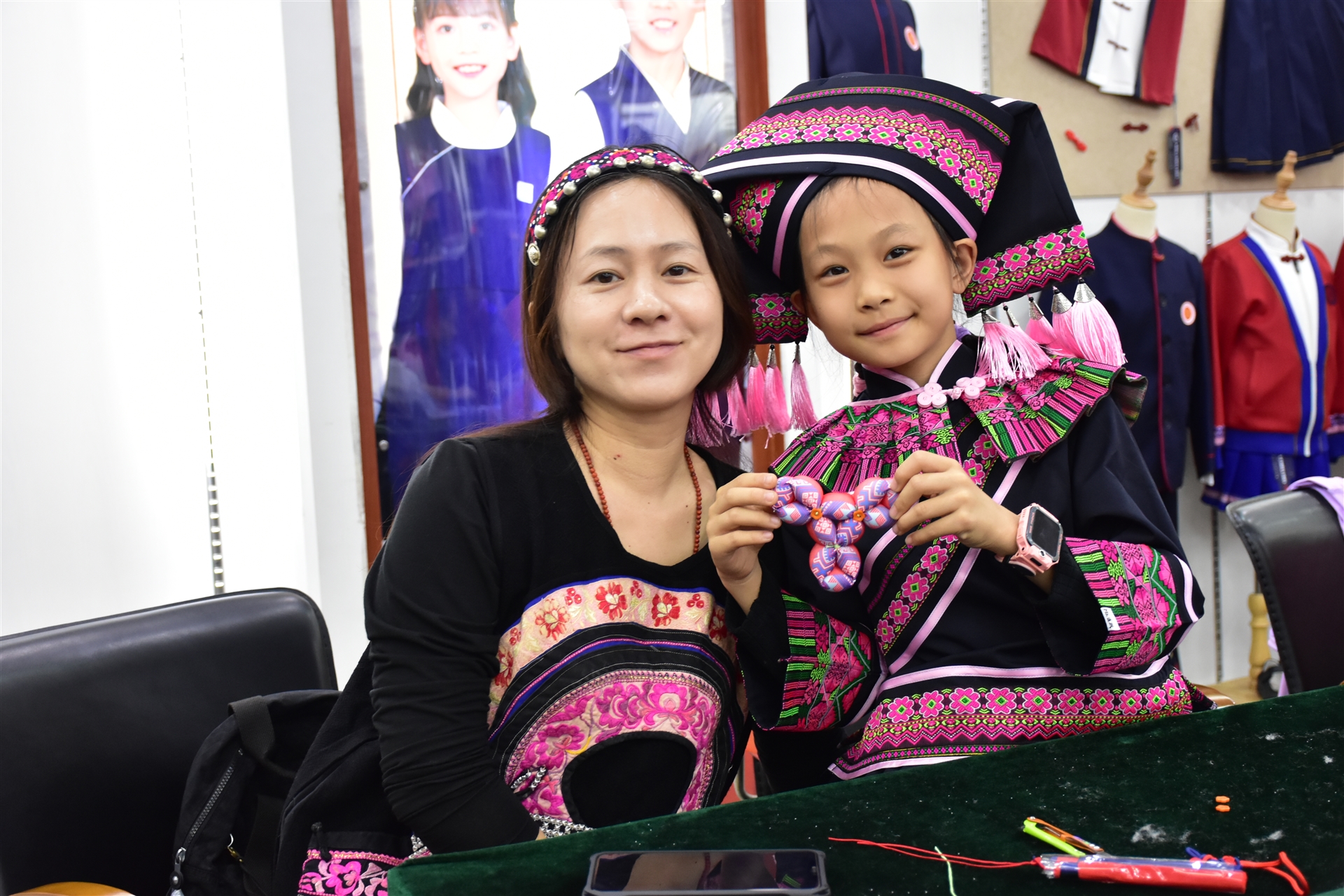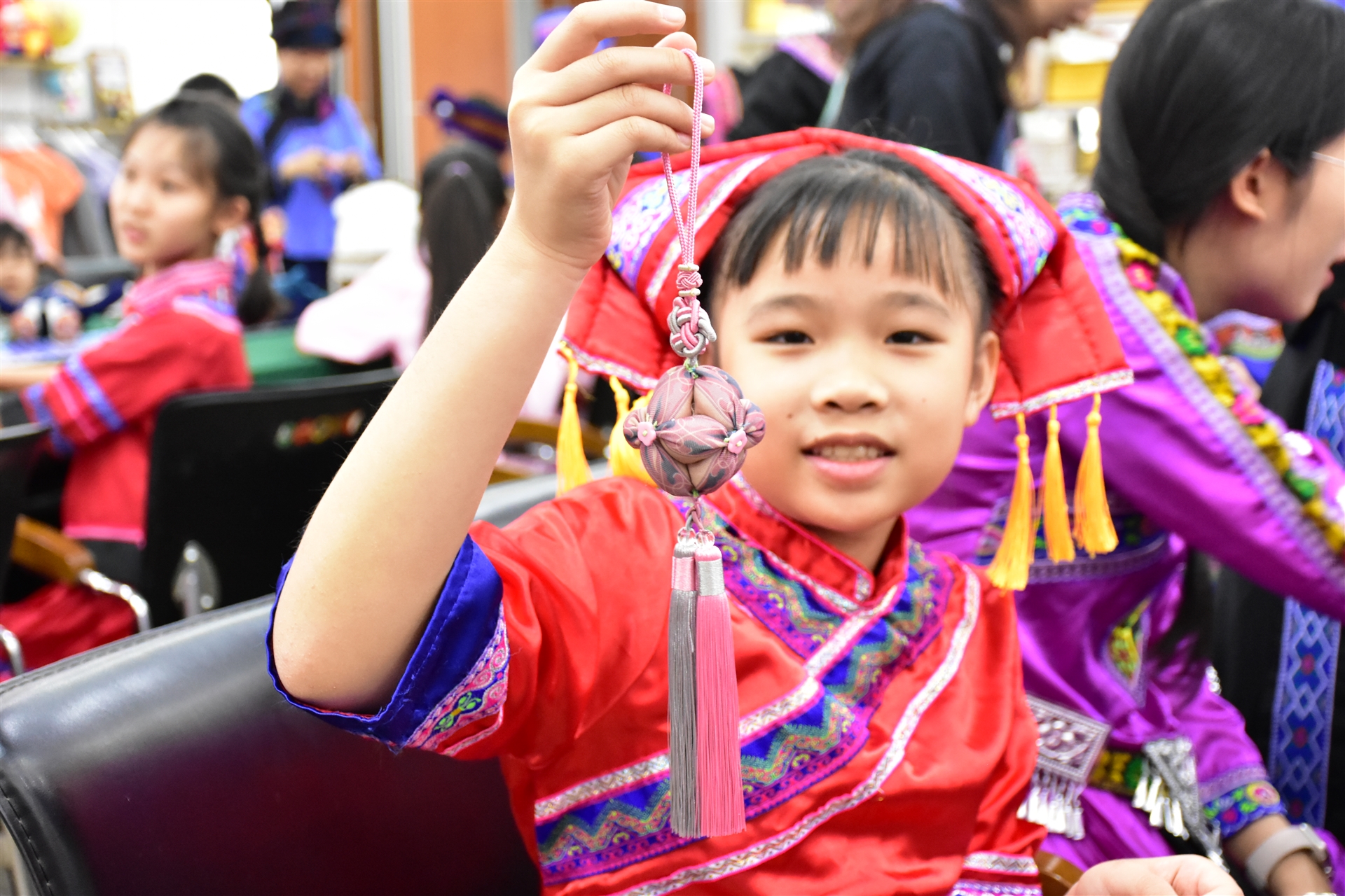 隨后,非遺老師向大家介紹了融入民族元素的校服,具有民族特色的手工藝品以及制作繡球的流程、技巧。