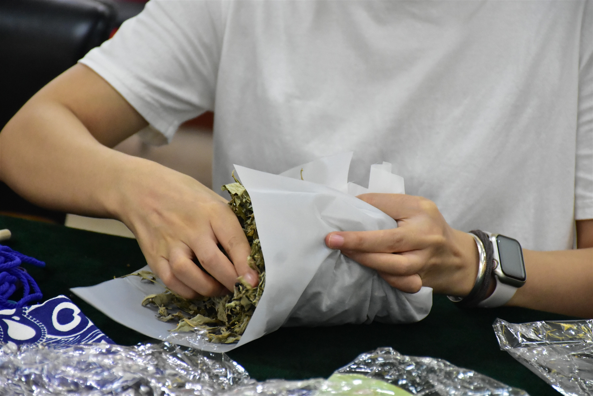 會議室被精心布置,桌上整齊擺放著艾草、彩線、小剪刀等制作材料,以及為員工準(zhǔn)備的粽子和水果,營造了一個充滿節(jié)日氛圍的環(huán)境。